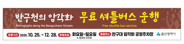 운영 기간은 오는 10월 25일부터 12월 28일까지이며, 운행 시간은 오전 9시 30분부터 오후 6시 30분까지다. 다만, 울산암각화박물관 휴관일인 월요일은 운행하지 않는다.
