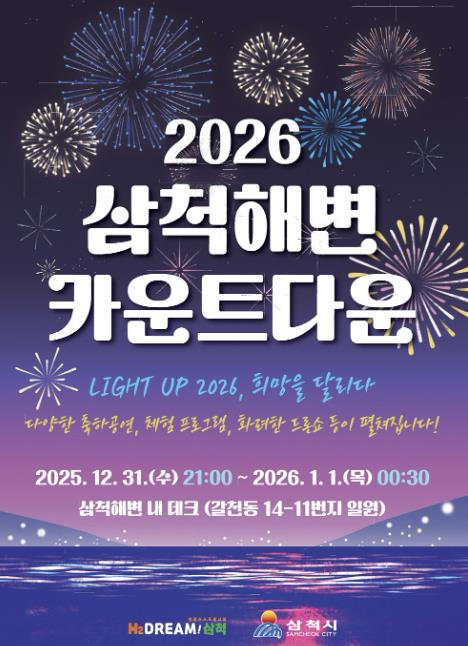 [뉴스다컴] 삼척시는 2025년의 마지막 밤과 2026년 새해 첫 아침을 삼척에서 맞이하려는 시민과 관광객이 함께 즐길 수 있는 다채로운 행사를 마련한다고 밝혔다.