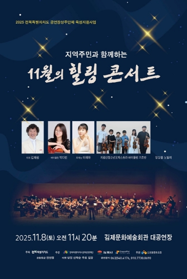 [뉴스다컴] 단순한 공연을 넘어 음악을 통해 세대와 지역이 함께 성장하고 소통하는 '지역주민과 함께하는 11월의 힐링 콘서트'가 오는 8일 오전 11시 20분 김제문화예술회관 대공연장에서 펼쳐진다.