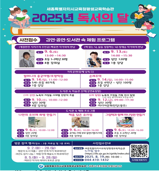 [뉴스다컴] 세종특별자치시교육청평생교육학습관(관장 김희경)은 2025년 독서의 달을 맞아 지역 주민의 독서 의욕을 고취하고 독서 문화 진흥에 대한 관심과 참여를 유도하기 위해 다양한 독서문화행사를 운영한다.