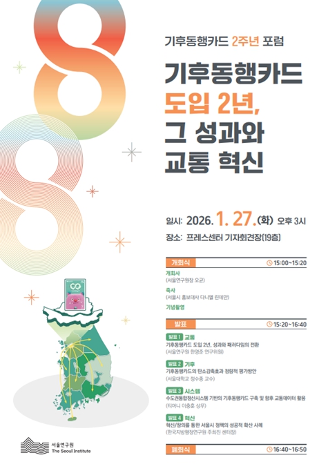이번 정책 포럼은 서울시 기후·교통 대표 정책인 기후동행카드의 도입 2주년을 맞아, 그간의 정책 성과를 종합적으로 점검하고 대중교통·기후 정책의 새로운 패러다임 전환 등을 다양한 시각으로 논의하기 위해 마련됐다.