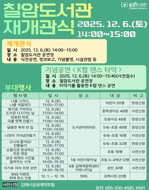 [뉴스다컴] 김해시 칠암도서관이 오는 6일 도서관 공연장에서 재개관식을 개최한다고 2일 밝혔다.