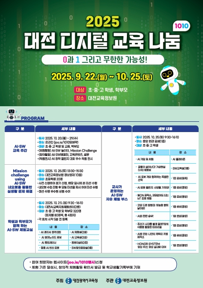 [뉴스다컴] 대전교육정보원은 ‘0과 1 그리고 무한한 가능성’을 주제로 ‘2025년 대전 디지털 교육 나눔1010’ 행사를 9월 22일부터 10월 28일까지 5주간 초·중·고 학생, 교원, 학부모를 대상으로 다채로운 온·오프라인 프로그램을 기획하여 성황리에 운영했다고 밝혔다.