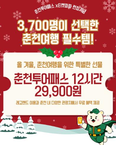 시 관계자는 “연말 춘천여행을 하루 동안 알차게 즐길 수 있도록 레고랜드를 포함한 12시간권을 기획했다”며 “겨울철 춘천을 찾는 가족·연인들에게 더 풍성한 여행 경험이 되길 바란다”고 말했다.