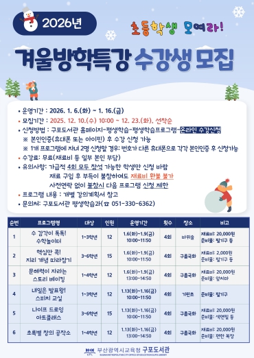 신미향 구포도서관장은 “겨울방학 특강을 통해 아이들이 즐겁게 배우며 스스로 탐구하는 힘을 기를 수 있기를 바란다”며 “앞으로도 도서관이 지역 아동의 성장을 지원하는 배움의 공간이 될 수 있도록 다양한 프로그램을 운영하겠다”고 말했다.