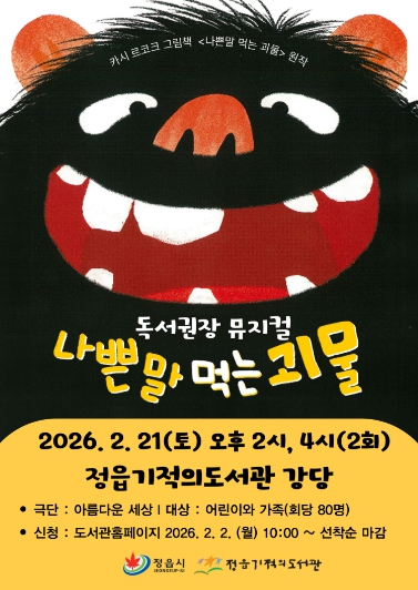 [뉴스다컴] 정읍기적의도서관은 겨울방학을 맞이해 어린이와 가족이 함께 즐길 수 있는 창작 뮤지컬 ‘나쁜 말 먹는 괴물’을 오는 21일 오후 2시와 4시, 총 2회 공연한다.
