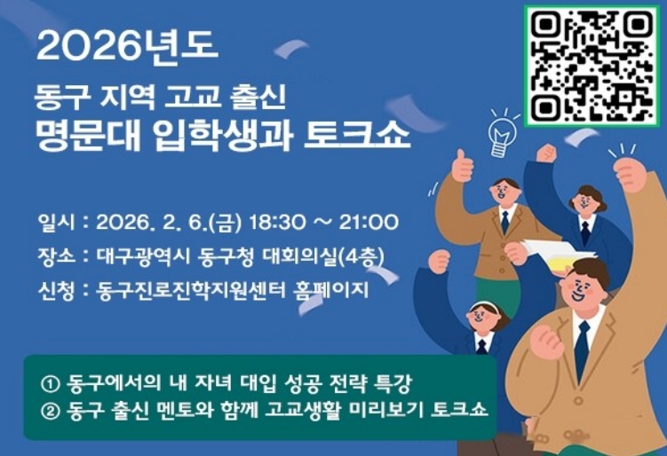 [뉴스다컴] 대구 동구청은 오는 6일 오후 6시 30분, 동구청 4층 대회의실에서 관내 학생 및 학부모를 대상으로 ‘2026 내 자녀 대입 성공 전략 특강 및 멘토와 함께 고교생활 미리보기 토크쇼’를 개최한다.