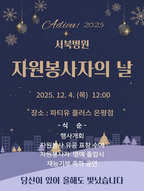 [뉴스다컴] 서울시 서북병원은 UN 지정 국제기념일인 ‘자원봉사자의 날’을 맞아 12월 4일 파티유플러스 은평점에서 ‘2025년 서북병원 자원봉사자의 날 기념행사’를 개최한다고 밝혔다. 이번 행사는 1년 동안 의료취약계층 환자의 곁을 지키며 따뜻한 손길을 전해 온 자원봉사자들의 노고를 격려하고, 자원봉사 문화 확산과 지역사회와의 동행을 다짐하는 자리로 마련됐다.