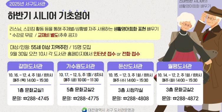[뉴스다컴] 대전 서구는 관내 4개 도서관에서 55세 이상 지역 주민을 대상으로 ‘2025년 하반기 시니어 기초영어’ 강좌를 개강한다고 23일 밝혔다.
