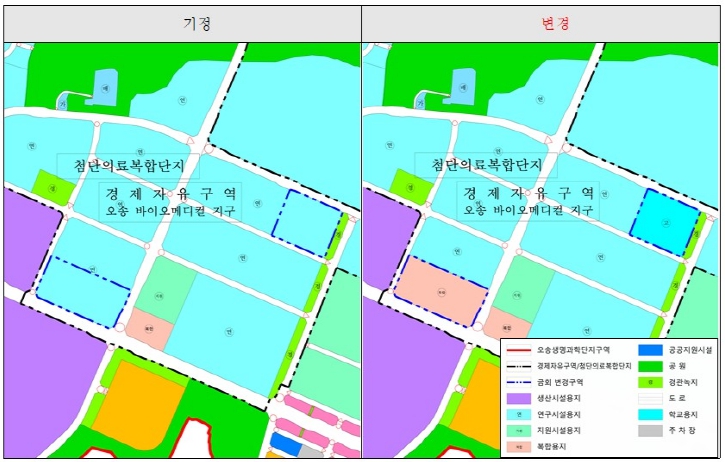 [뉴스다컴] 충북도는 11월 17일 오송첨단의료복합단지의 토지이용계획을 변경하는 개발실시계획이 승인됐다고 밝혔다. 이를 통해 오송읍 연제리 682-2, 682-3은 연구시설용지에서 복합용지로, 연제리 657은 연구시설용지에서 학교시설용지로 변경된다.