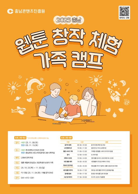 [뉴스다컴] 충남콘텐츠진흥원은 충남의 웹툰 문화 활성화와 가족이 함께하는 창의적 웹툰 문화체험을 제공하기 위해 ‘2025 충남 웹툰 창작체험 가족 캠프’를 개최한다.
