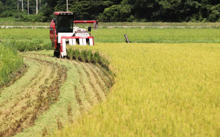 | ▲ 볏짚을 갈아넣기 위해 볏짚을 잘라내며 벼를 수확하고 있다. |