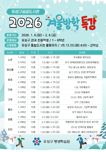 [뉴스다컴] 대전 유성구는 내년 1월 6일부터 2월 6일까지 관내 8개 공공도서관에서 초등학생 대상으로 ‘겨울방학 특강’을 운영한다.