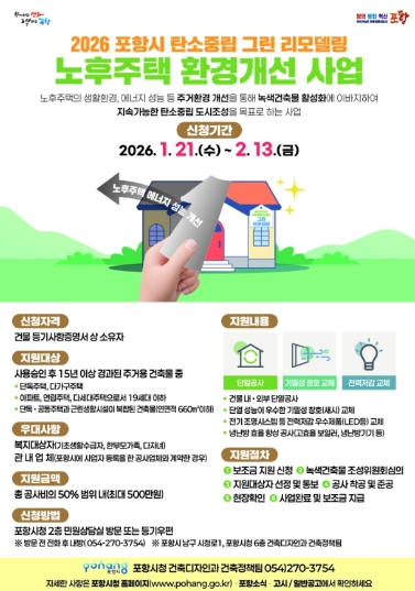 [뉴스다컴] 포항시는 노후주택의 주거환경 개선과 에너지 비용 절감을 위해 2026년도 그린리모델링 지원사업을 시행한다.