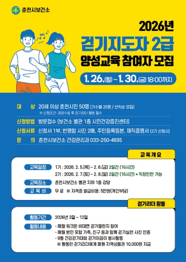 [뉴스다컴] 춘천시보건소가 시민의 걷기 실천 역량을 높이고 지역사회 중심의 걷기문화를 확산하기 위해 ‘2026년 걷기지도자 2급 양성 교육’ 참여자를 모집한다.