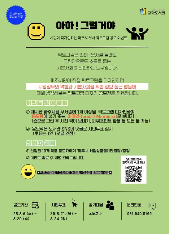 [뉴스다컴] 파주시 교하도서관 시정홍보 혁신동아리 ‘아하 그래’는 파주시 부서 그림기호(픽토그램) 그리기 행사 ‘아하! 그럴 거야’를 8월 6일부터 20일까지 운영한다.