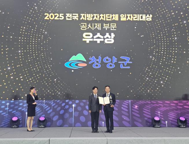 [뉴스다컴] 청양군은 지난 30일 청주오스코 2층 그랜드볼룸에서 열린 고용노동부 주관 ‘2025 전국 지방자치단체 일자리대상’ 공시제 부문에서 우수상을 수상했다고 밝혔다.