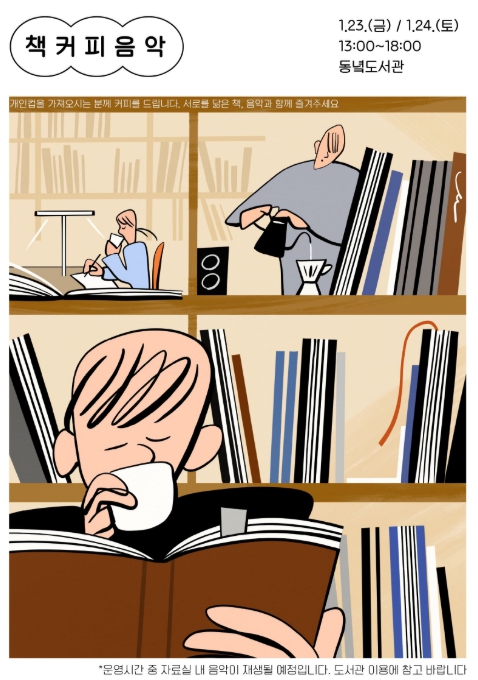23일과 24일에는 ‘겨울을 닮은 책과 음악’을 주제로 오는 오후 1시부터 6시까지 운영되며 기간에 개인용 컵을 지참하고 도서관 2층 종합자료실을 방문하는 이용자는 겨울 감성이 담긴 전시와 음악을 감상하며 사서가 내려주는 따뜻한 원두커피를 무료로 즐길 수 있다.
