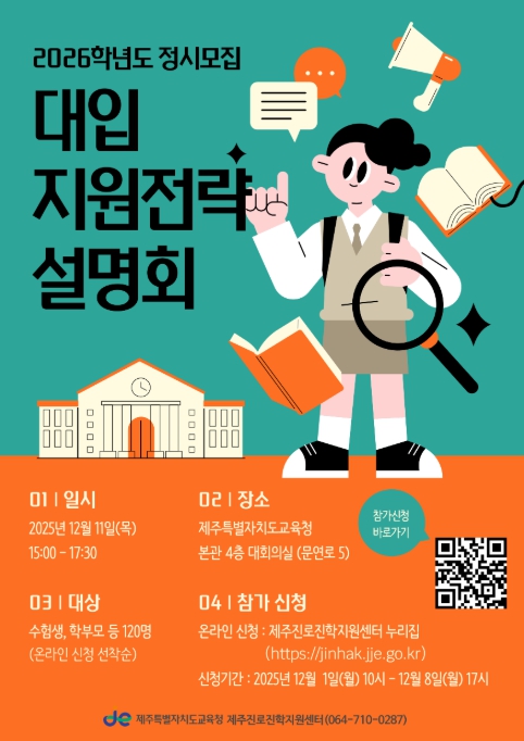 [뉴스다컴] 제주특별자치도교육청은 12월 11일 오후 3시부터 본관 4층 대회의실에서 ‘2026학년도 대입 정시모집 지원전략 설명회’를 개최한다.