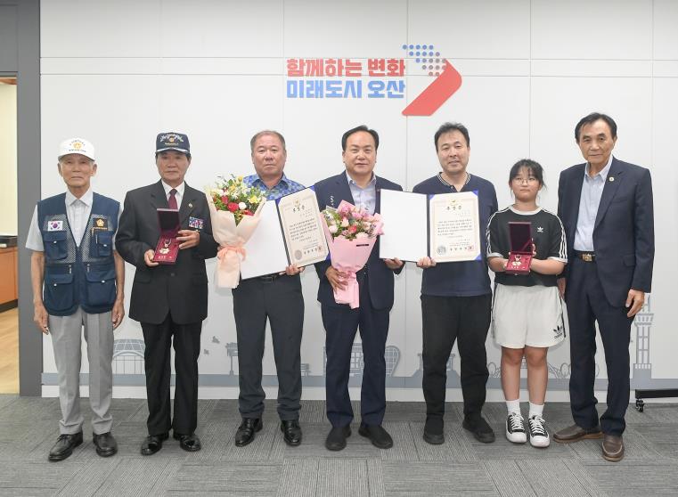 [뉴스다컴] 오산시는 지난 20일, 6·25전쟁 참전유공자인 고(故) 박재수 하사와 고(故) 이호천 병장의 유가족에게 화랑무공훈장과 훈장증을 전수했다고 밝혔다.