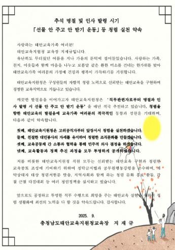[뉴스다컴] 충청남도태안교육지원청은 추석 연휴 시기를 맞아 청렴한 공직문화를 확산하기 위해 ‘선물 안 주고 안 받기 운동’을 강조하는 청렴 서한문을 홈페이지에 게시했다.