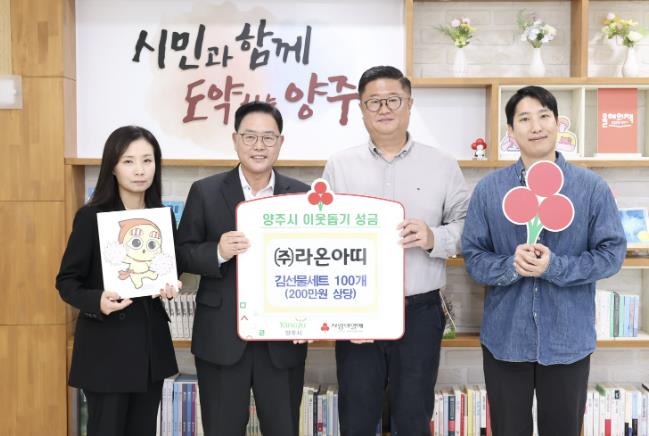 강수현 양주시장은 “매년 꾸준히 다양한 사회공헌활동을 통해 지역사회 발전에 힘쓰시고 있는 라온아띠 대표님과 임직원분들께 진심으로 감사드린다.”며, “기탁받은 성품은 지역의 어려운 이웃을 돕는데 소중하게 쓰겠다.”고 전했다.
