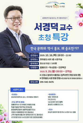 [뉴스다컴] 거창군은 한마음도서관에서 10월 16일 저녁 7시 한국을 세계에 널리 알리는 대표 홍보전문가 서경덕 교수 초청 특강을 개최한다.