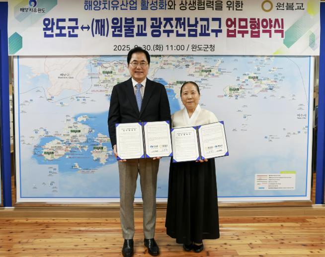 [뉴스다컴] 완도군이 완도 해양치유산업 활성화를 위해 (재)원불교 광주전남교구와 업무 협약을 체결했다.