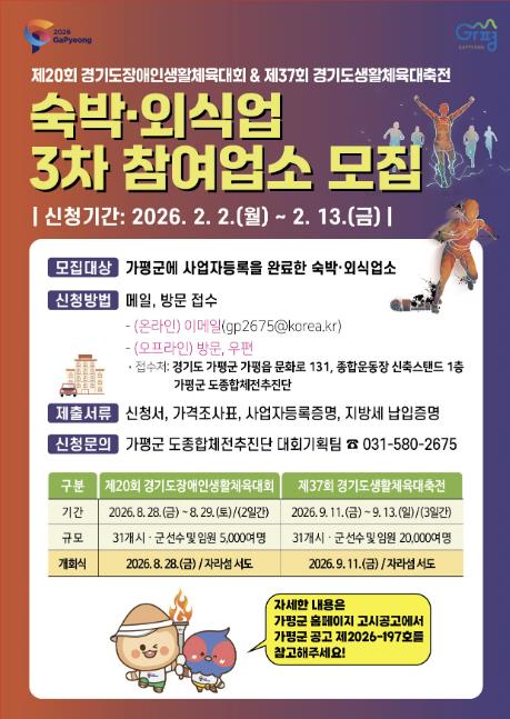 모집기간은 오는 2월 2일부터 13일까지 2주간이다. 모집대상은 공고일 기준 가평군에 인·허가, 등록, 영업신고 후 사업자등록을 완료한 숙박·외식업소이다. 참여하는 숙박업소는 숙박요금을 사전 신고해야 하며, 사전 경기를 포함한 체육대회 기간 중에는 선수단 외에 대실을 위한 퇴실과 추가 금액을 요구해서는 안된다.