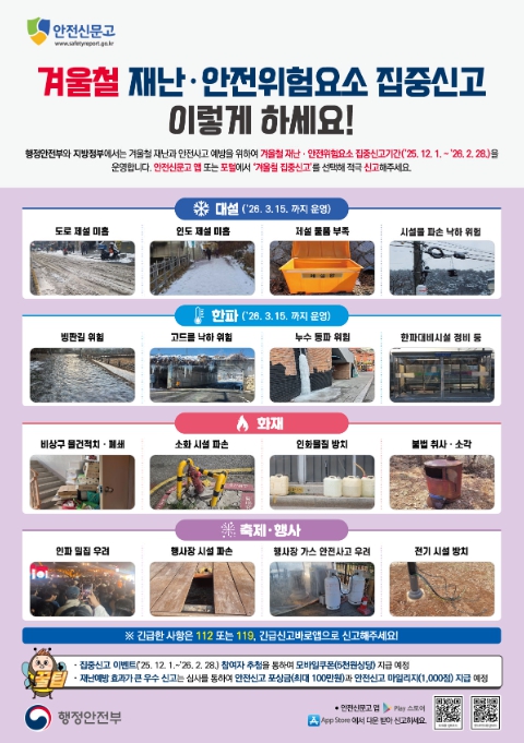 양수호 안전총괄과장은 “시민 한 분 한 분이 주변의 눈길·빙판, 한파·화재 위험 등을 세심하게 살펴 신고해 주신다면 보다 안전한 겨울을 함께 만들어 갈 수 있을 것”이라며, 적극적인 참여를 당부했다.