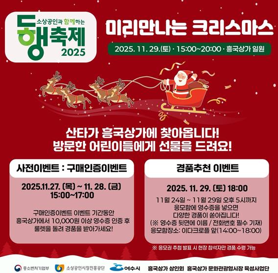 [뉴스다컴] 여수시는 오는 11월 29일 흥국상가 일원에서 연말 맞이 특별행사 ‘미리 만나는 크리스마스’를 개최한다고 밝혔다.