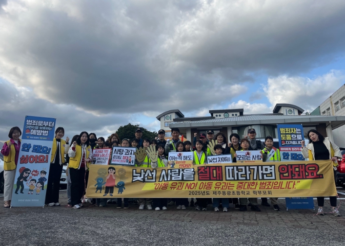 [뉴스다컴] 제주도교육청 동광초등학교는 27일 등굣길에 학부모회와 전교어린이회, 교직원, 동부경찰서가 함께 참여한 어린이 유괴예방 캠페인을 실시했다.