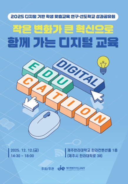 [뉴스다컴] 제주특별자치도교육청은 12일 제주한라대학 한라컨벤션홀에서 ‘2025 디지털 기반 학생 맞춤교육 연구·선도학교 운영결과 공유회’를 개최한다.