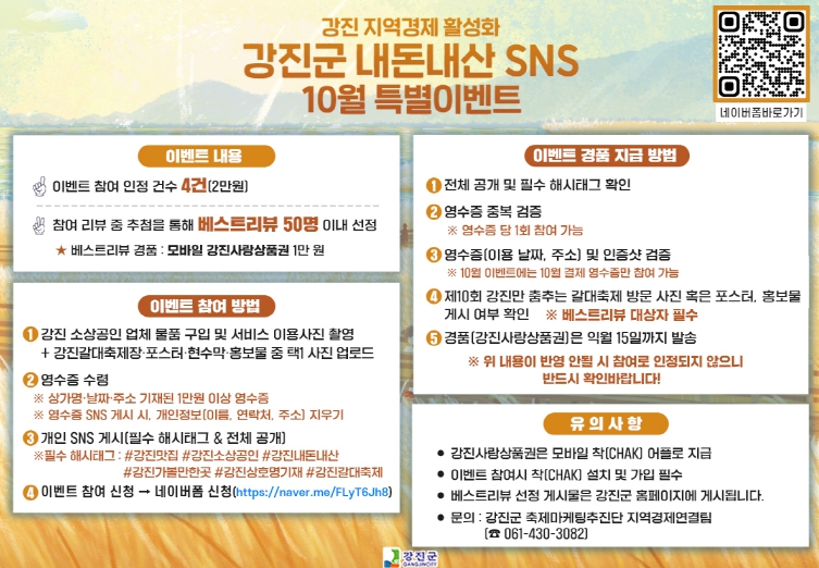 [뉴스다컴] 강진군이 제10회 강진만춤추는 갈대축제를 기념해 관내 소상공인 업소 활성화와 홍보 지원을 위해 추진 중인 ‘강진군 내돈내산 SNS 리뷰 이벤트’를 10월 한 달간 특별하게 진행한다.