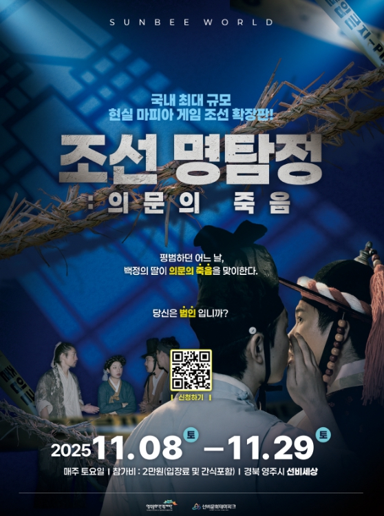 [뉴스다컴] 영주시 선비세상에서 오는 11월 8일부터 매주 토요일, 참가자가 직접 조선시대 인물이 되어 연쇄 살인 사건의 진실을 밝혀야 하는 국내 최대 규모 체험형 마피아 게임 ‘조선명탐정: 의문의 죽음’이 개최된다.