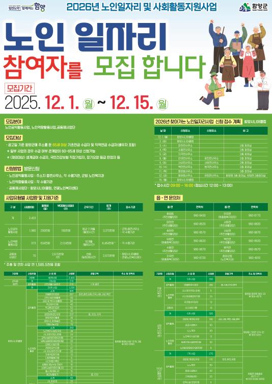 [뉴스다컴] 함양군은 어르신들의 안정적인 소득 보전과 사회참여활동을 확대하기 위해 12월 1일부터 15일까지 ‘2026년 노인일자리 및 사회활동지원사업’ 참여자를 모집한다.