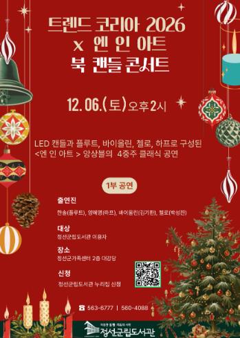 [뉴스다컴] 정선군립도서관은 오는 12월 6일 오후 2시, 정선군 가족센터 2층 대강당에서 ‘트렌드 코리아 2026 × 엔 인 아트 북 캔들 콘서트’를 개최한다고 2일 밝혔다.