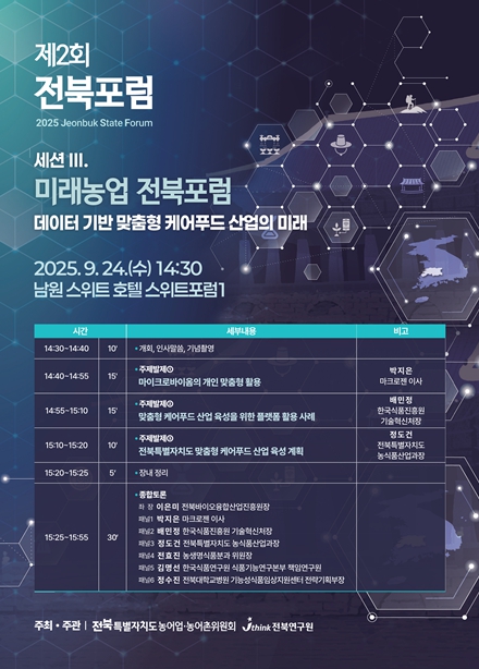 [뉴스다컴] 전북특별자치도는 오는 24일 남원 스위트호텔에서 '데이터 기반 맞춤형 케어푸드 산업의 미래'를 주제로 '미래농업 전북포럼'을 연다고 22일 밝혔다.