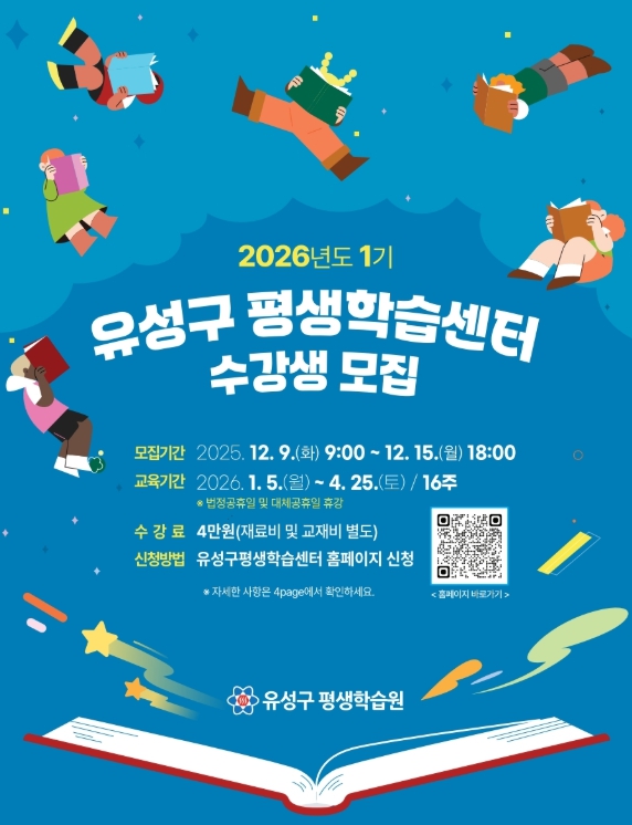 [뉴스다컴] 대전 유성구는 오는 9일부터 15일까지 구암평생학습센터와 전민평생학습센터에서 운영하는 ‘2026년도 1기 평생학습센터’ 수강생을 모집한다.