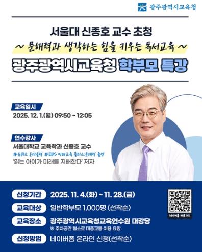 [뉴스다컴] 광주시교육청이 오는 12월 1일 오전 9시 40분 광주시교육청교육연수원 대강당에서 서울대학교 교육학과 신종호 교수 초청 학부모 특강을 진행한다.