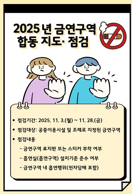 중점 점검사항은 ▲금연구역 내 흡연행위(전자담배 포함) ▲금연구역 표지판 및 스티커 부착 여부) ▲흡연실 설치 기준 준수 등이며, 위반사항 적발 시 시정명령과 과태료 부과 조치가 이루어진다.