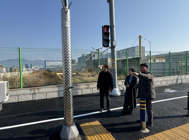 | ▲ 계자들이 해룡·율촌산단 보행로 정비 완료 현장을 둘러 보고 있다. |