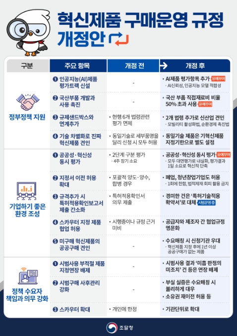 주요 개정 내용은 AI 제품에 대한 별도 혁신제품 평가 기준을 신설한다. AI 제품의 신뢰성, AI 모델의 적합성 등의 평가 항목을 마련해 더 많은 AI 제품이 혁신제품으로 지정될 수 있게 한다.
