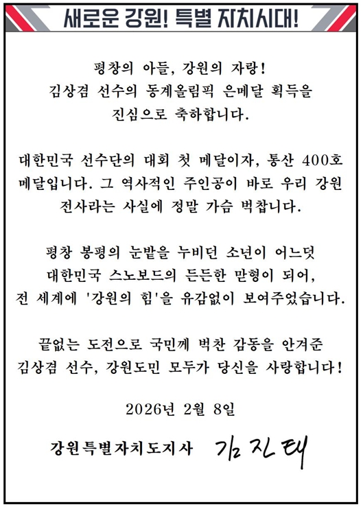[뉴스다컴] 김진태 도지사는 8일 2026 밀라노-코르티나담페초 동계올림픽대회에서 강원특별자치도(하이원 스포츠단) 소속 김상겸 선수의 남자 스노보드 평행대회전 은메달 획득을 축하하며, 축전을 보냈다.