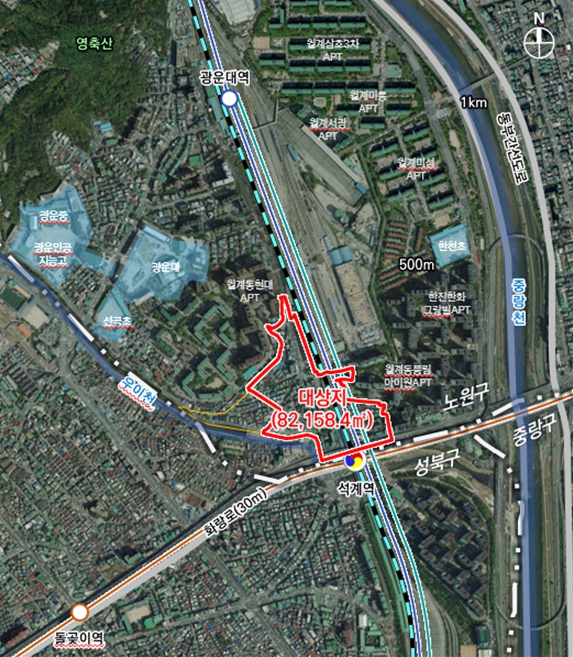 대상지는 지하철 환승역인 석계역 일대로, 역세권 중심기능 및 연결기능 강화를 목표로 82,158㎡ 규모의 지구단위계획구역 신설 계획을 수립했다.