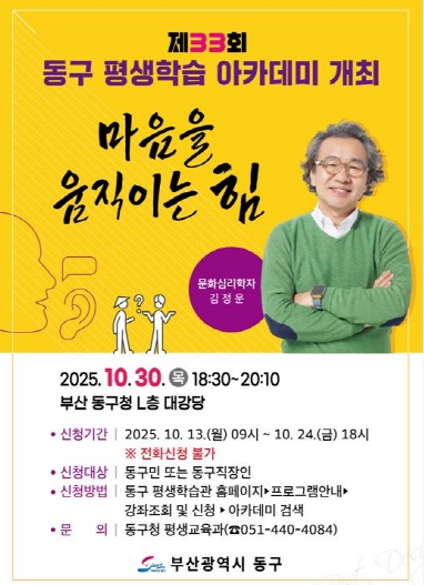 [뉴스다컴] 부산 동구는 오는 10월 30일, 동구청 층 대강당에서 문화심리학자 김정운 소장