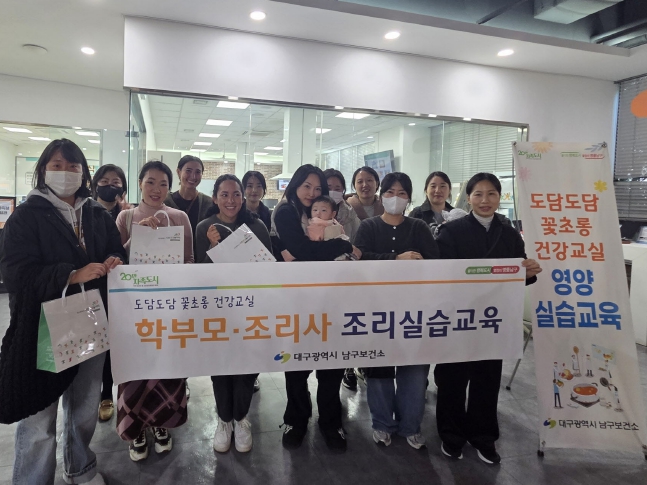 [뉴스다컴] 대구 남구보건소는 지난 24일 유아 건강관리 프로그램 ‘도담도담 꽃초롱 건강가꾸기’사업의 일환으로 관내 유치원 및 어린이집의 학부모 등을 대상으로 조리실습 및 식생활 인식 개선 교육을 진행했다.