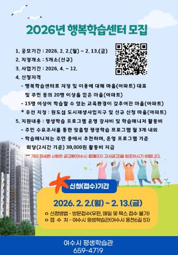 [뉴스다컴] 여수시는 주민 생활권 중심의 평생학습 기회를 확대하기 위해 '2026년 읍·면·동 행복학습센터' 신규 지정 사업에 참여할 마을(아파트)을 모집한다고 밝혔다.