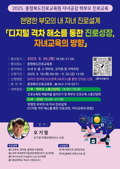 [뉴스다컴] 충청북도교육청 직속기관 진로교육원은 오는 30일 18시에 학부모들이 변화하는 미래사회에 맞춰 자녀의 진로설계 역량을 강화할 수 있도록 2025 하반기 학부모 진로교육을 운영한다고 밝혔다.