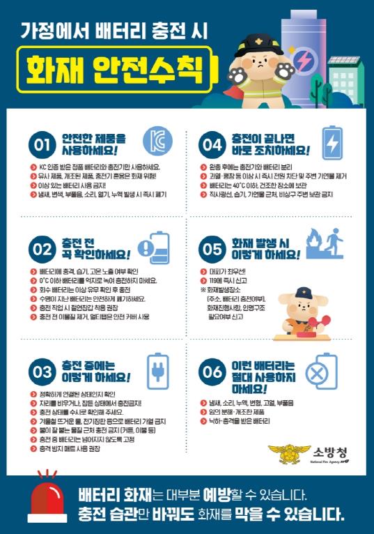 소방서는 이러한 배터리 화재 사례를 통해 전동킥보드와 전기자전거와 같은 생활 속 배터리 사용 기기의 안전수칙을 다시 한번 강조하고 나섰다. ▲KC 인증 제품 사용 ▲과충전 주의 ▲외출 및 취침 시 충전 금지 ▲현관문·비상구 근처에서 충전 금지 등과 같은 화재예방 수칙을 안내하며 배터리의 이상이 발견되면 즉시 사용을 중단하고 119에 신고할 것을 당부했다.